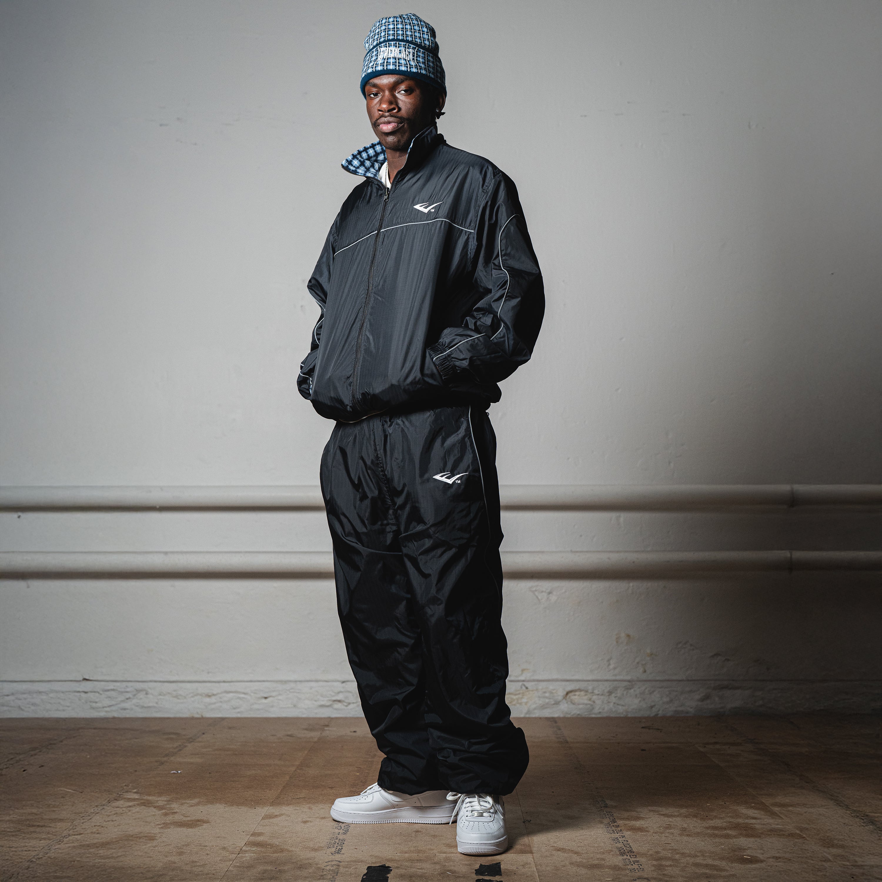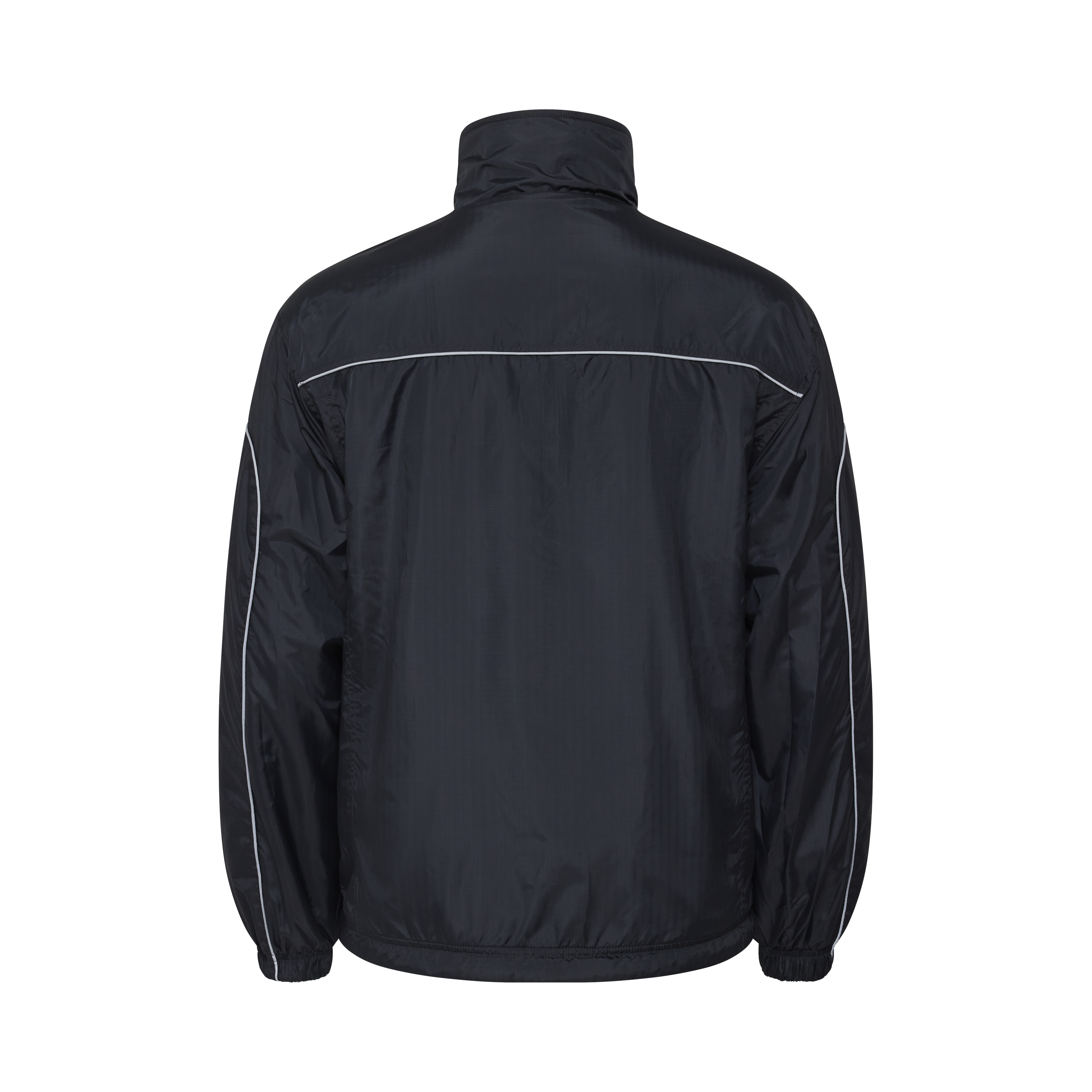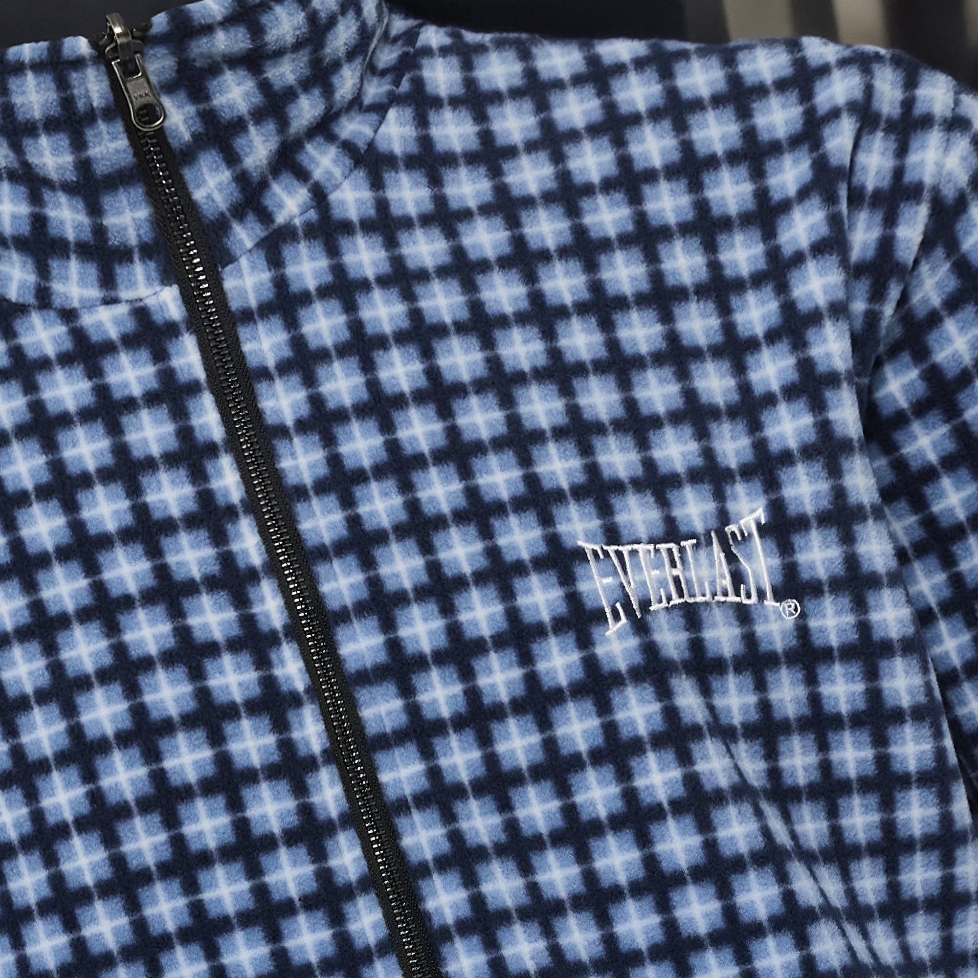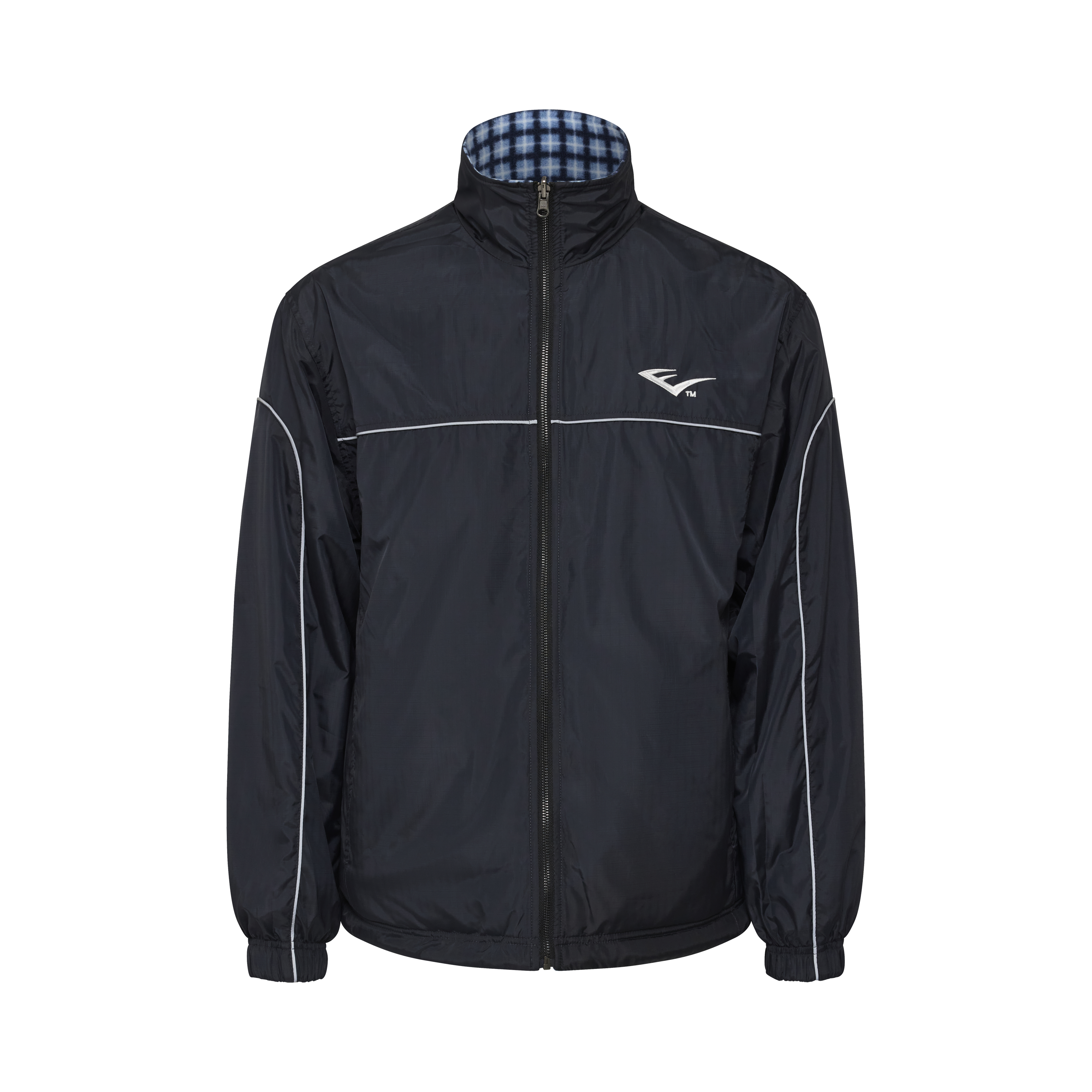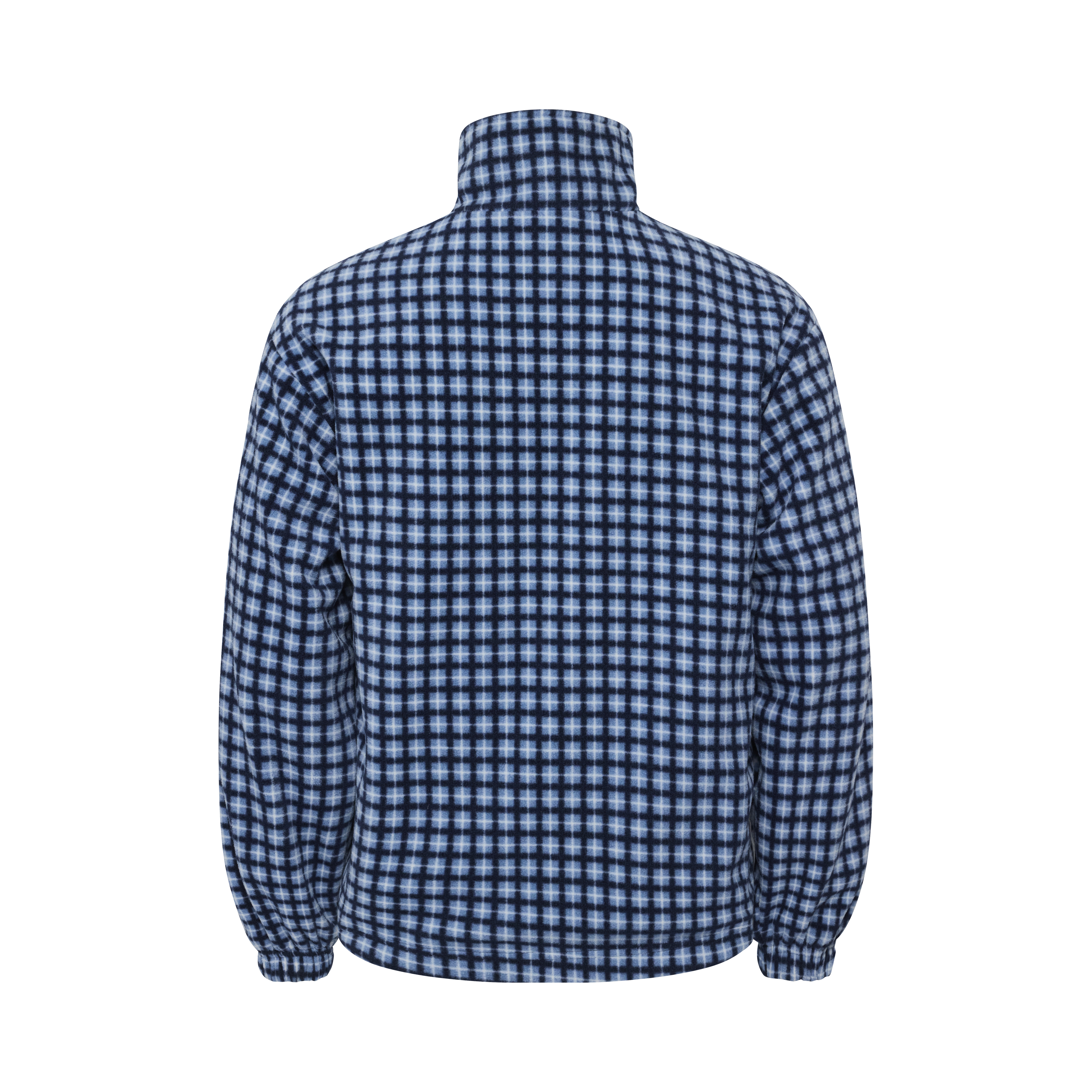Featuring one side with poly midnight navy shell & reflex linings. The other side features a checkered fleece shell.