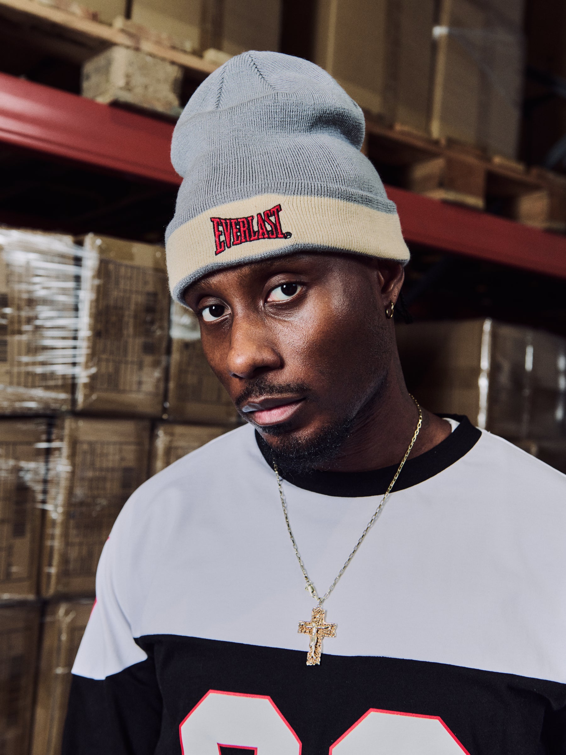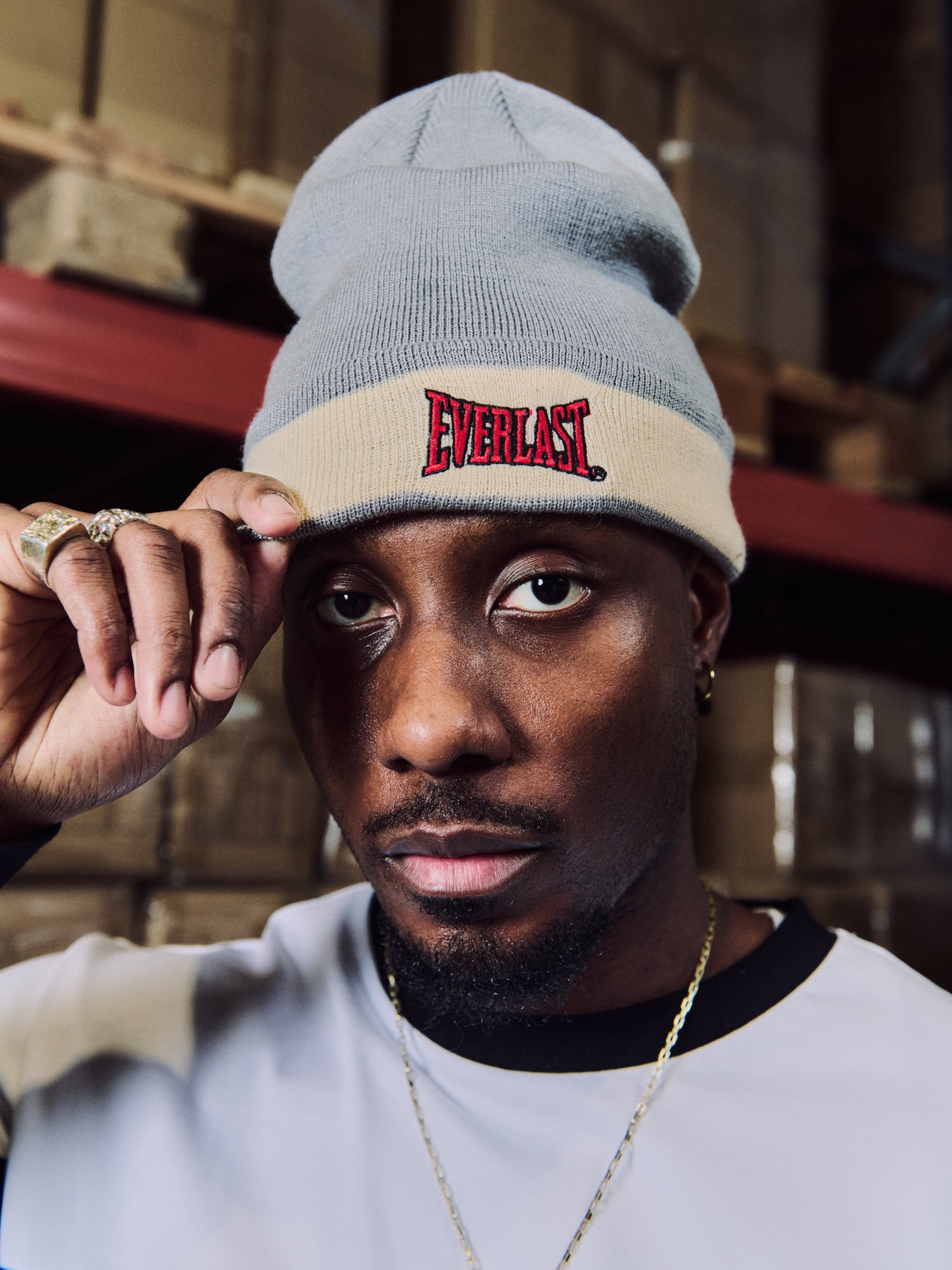 The “Knock Out Beanie” is a knitted beanie with a fold-up cuff, finished with a front logo detail and a clean, minimal look.